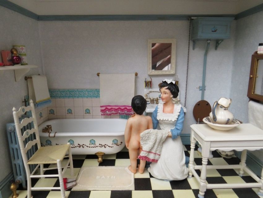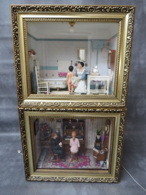 TWO DIORAMA ROOM BOXES, displaying a Victorian bathroom and a parlour