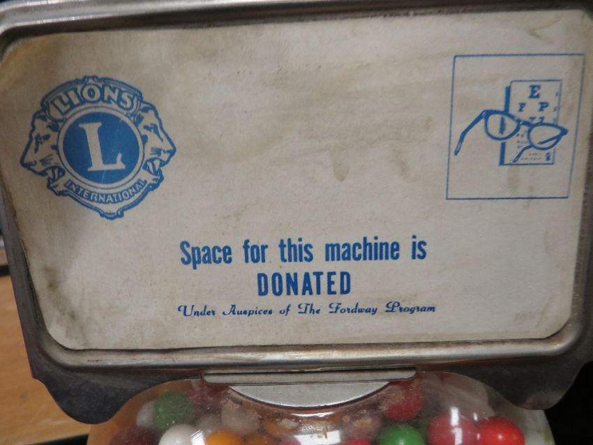 A VINTAGE FORD GUMBALL MACHINE & Co VENDING MACHINE, with label panel to the top, raised on a chromed stand, overall H 106 cm
