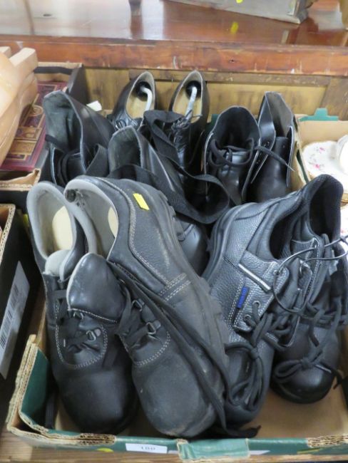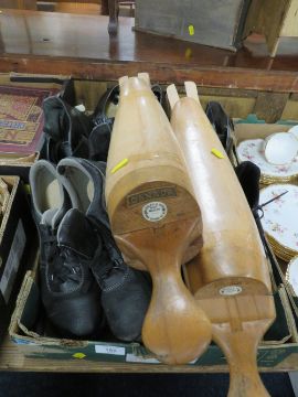 A PAIR OF VINTAGE WOODEN BOOT LASTS BY BARTLEY & BARTLEY AND SONS BOOTMAKERS 493 OXFORD STREET LONDON TOGETHER WITH WORK BOOTS ETC