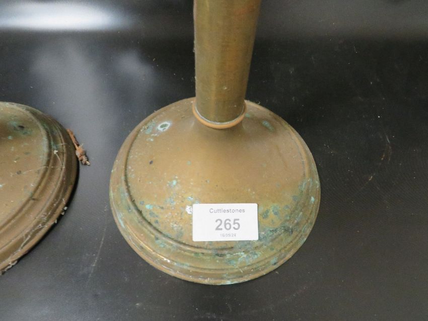 AN PAIR OF GILT METAL ECCLESIASTICAL CANDLESTICKS - 'ST MARYS ABBEY'