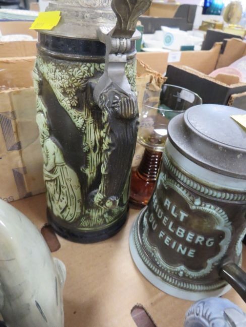 A TRAY CONTAINING BEER STEINS, ROYAL DOULTON CHARACTER JUG ETC