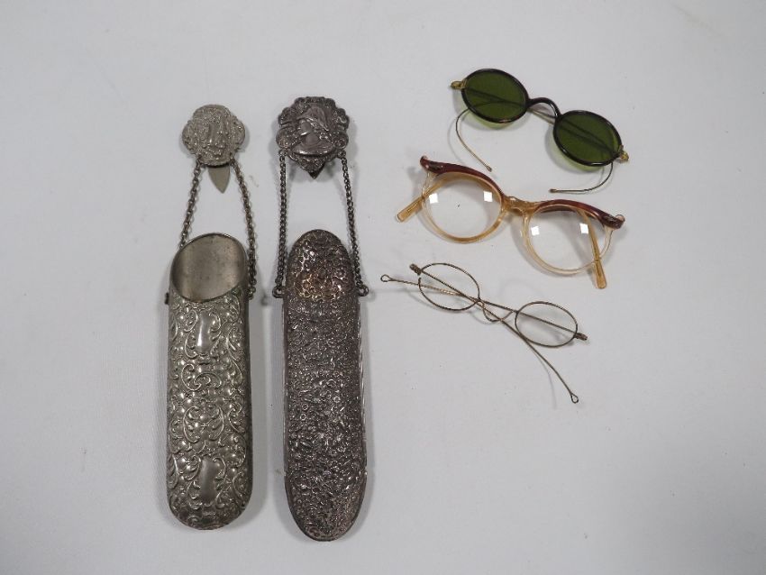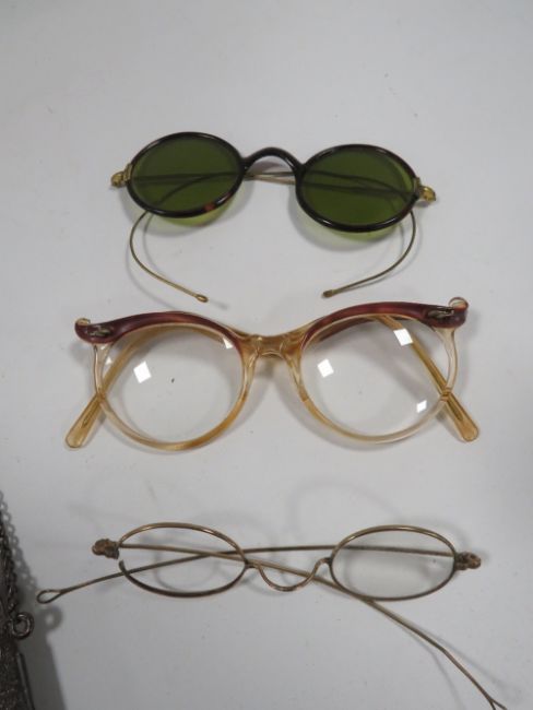 A COLLECTION OF VINTAGE SPECTACLES AND WHITE METAL SPECTACLE HOLDERS ETC TO INCLUDE A VINTAGE PAIR OF SUNGLASSES