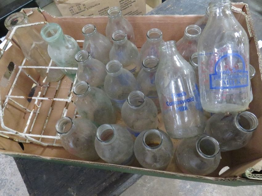 A QUANTITY OF RETRO GLASS EMPTY MILK BOTTLES