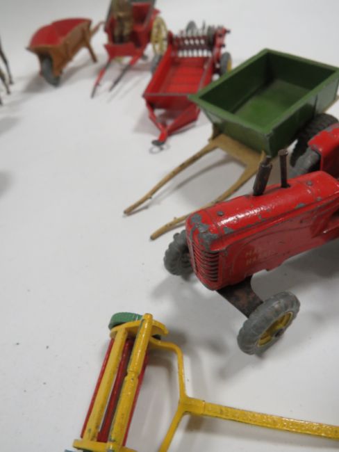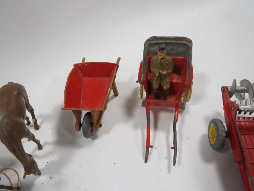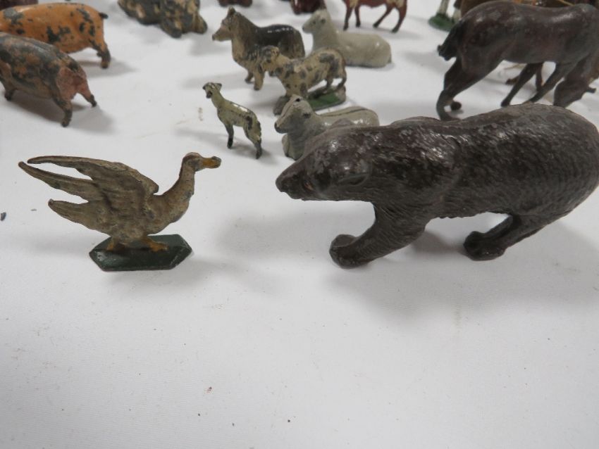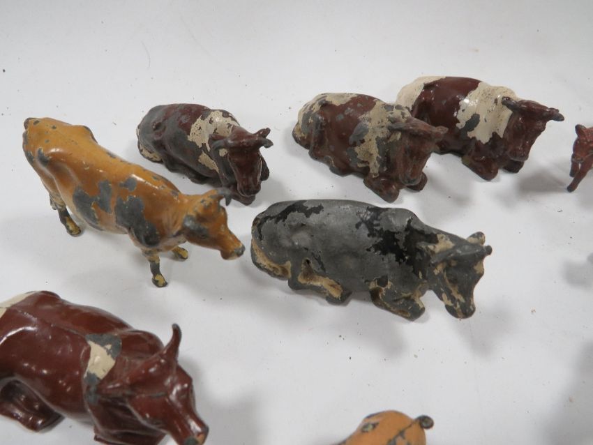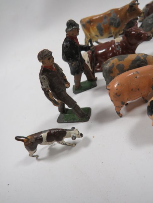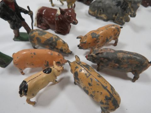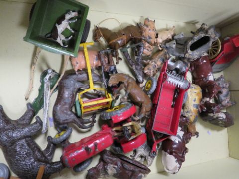 A BOX CONTAINING VINTAGE METAL FARM ANIMALS ETC