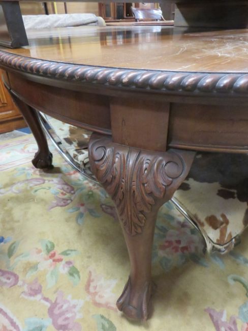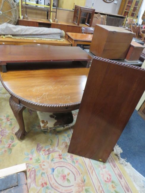 A LARGE EARLY 20TH CENTURY MAHOGANY WIND-OUT DINING TABLE ON BALL & CLAW FEET - TWO LEAVES