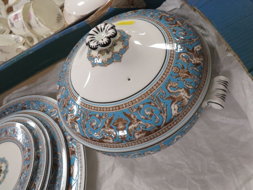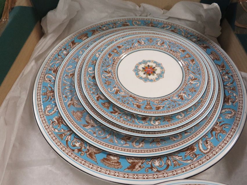 A BOX CONTAINING WEDGWOOD FLORENTINE TUREEN, PLATES ETC