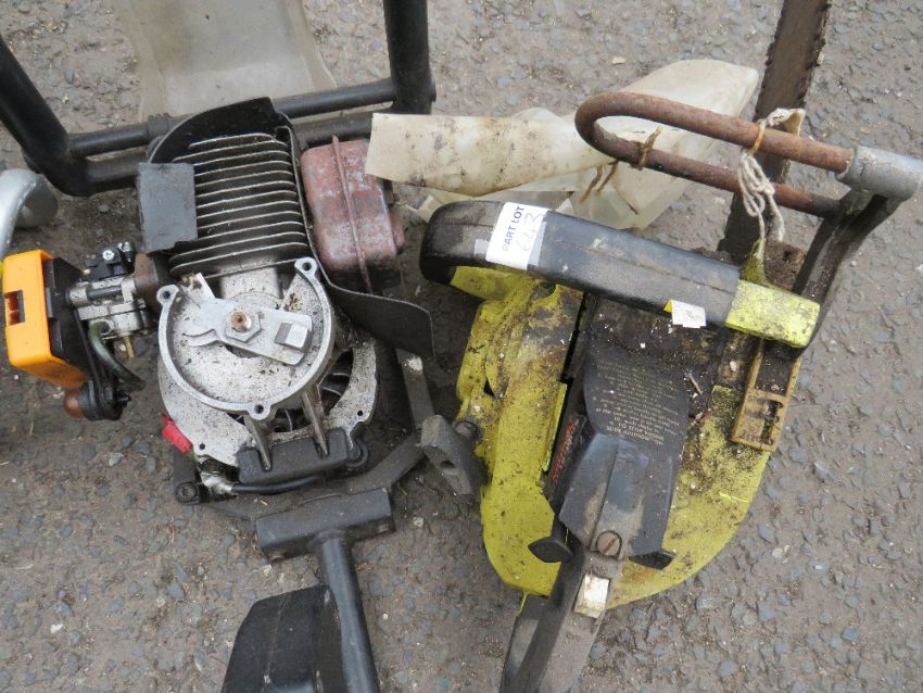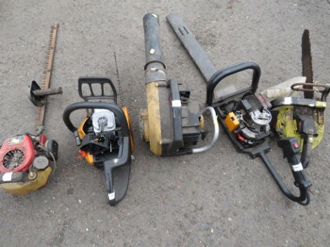 A QUANTITY OF FIVE PETROL GARDEN TOOLS TO INCLUDE 2 x CHAINSAWS, 2 x HEDGE CUTTERS AND A LEAF BLOWER- SPARES OR REPAIR