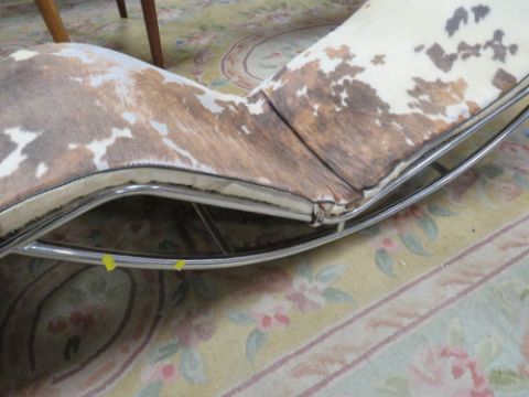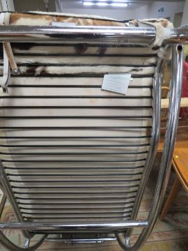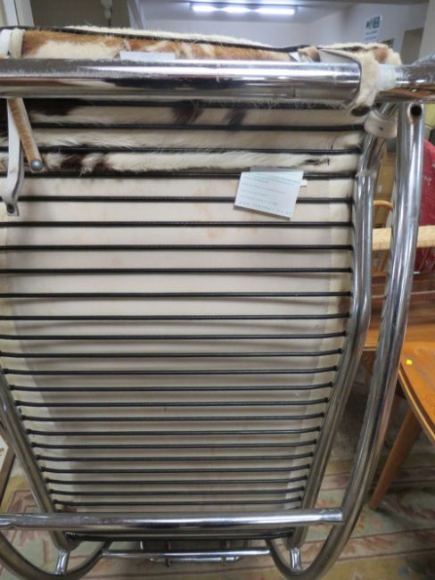 A RETRO STYLE CHROMED AND COW HIDE LOUNGE CHAIR IN THE MANNER OF LE CORBUSIER