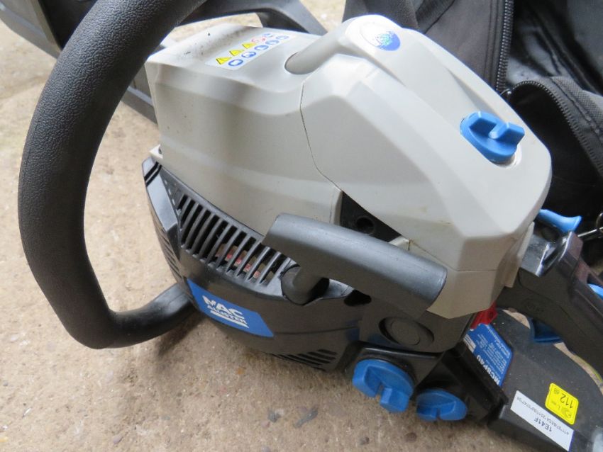 A MACALLISTER PETROL CHAINSAW WITH INSTRUCTIONS AND BAG