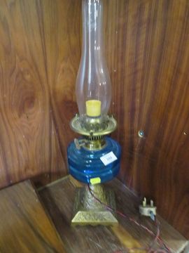 A VINTAGE CONVERTED OIL LAMP WITH BLUE GLASS RESERVOIR