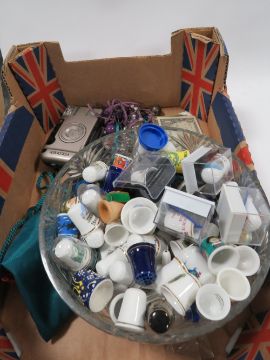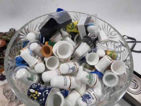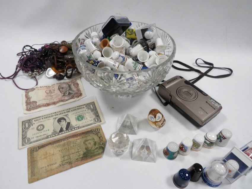 A TRAY OF COLLECTABLE'S TO INCLUDE COSTUME JEWELLERY, THIMBLES ETC