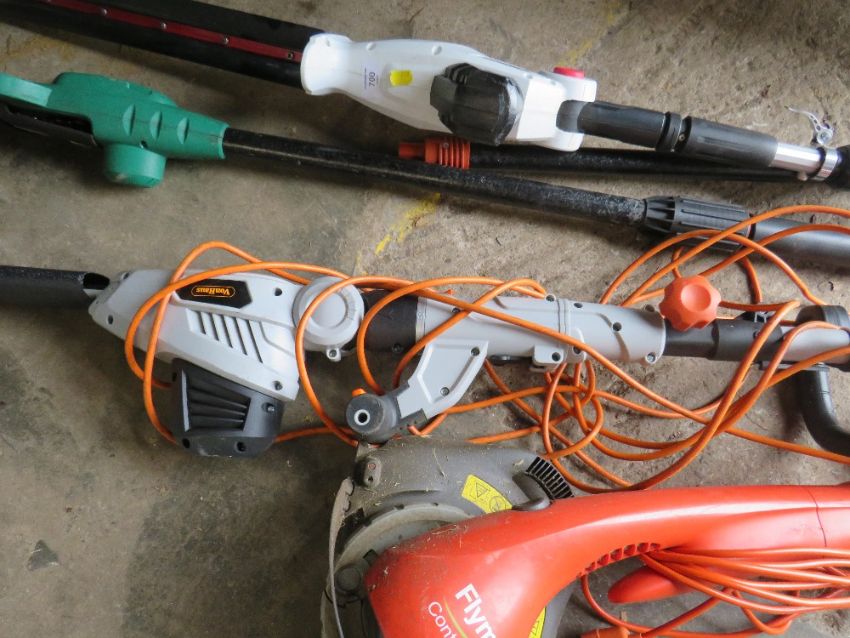A SELECTION OF ELECTRIC GARDEN TOOLS TO INCLUDE A FLYMO STRIMMER AND EXTENDABLE HEDGE TRIMMERS ETC
