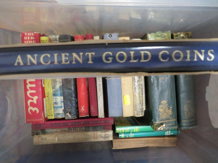 THREE BOXES OF VINTAGE HARDBACK BOOKS INCLUDING CRIME, NOVELS, NON FICTION, MILITARY ETC