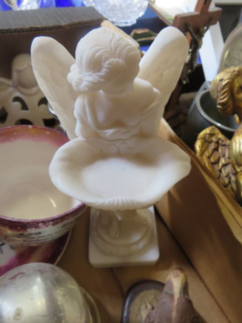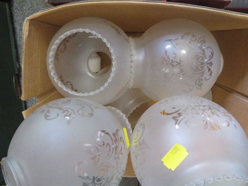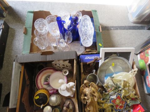 FIVE TRAYS OF ASSORTED CERAMICS TO INCLUDE ROYAL ALBERT, GLASSWARE, LIGHT SHADES ETC