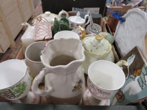 TWO TRAYS OF CERAMICS ETC TO INCLUDE ROYAL DOULTON LIMITED EDITION 12 DAYS OF CHRISTMAS GOBLETS, COLLECTABLE TEA POTS TO INCLUDE ROYAL ALBERT SWEET VIOLETS ETC