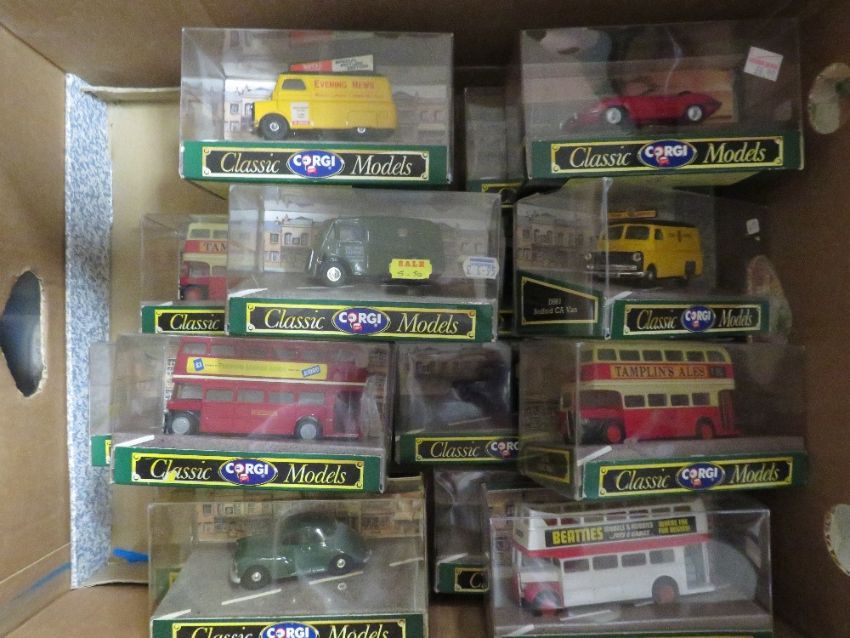 SIXTEEN BOXED CORGI CLASSIC DIE CAST VEHICLES TO INCLUDE MORRIS MINOR, FORD POPULAR, BEDFORD AND DOUBLE DECKER BUSES