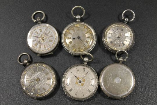 SIX VARIOUS SILVER CASED AND SILVER FACED POCKET WATCHES