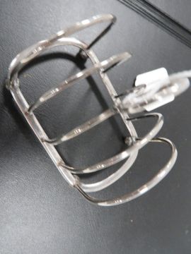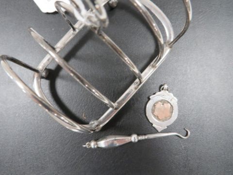 A SMALL SILVER TOAST RACK, SILVER FOB AND SILVER HANDLED BUTTON HOOK