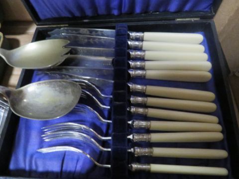 A TRAY OF SUNDRIES TO INCLUDE TREEN AND BOXED CUTLERY