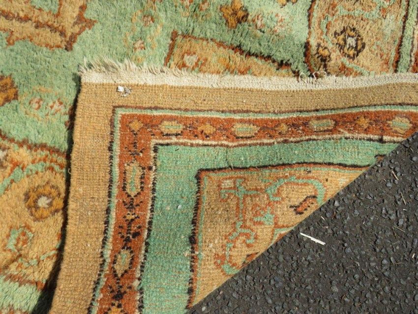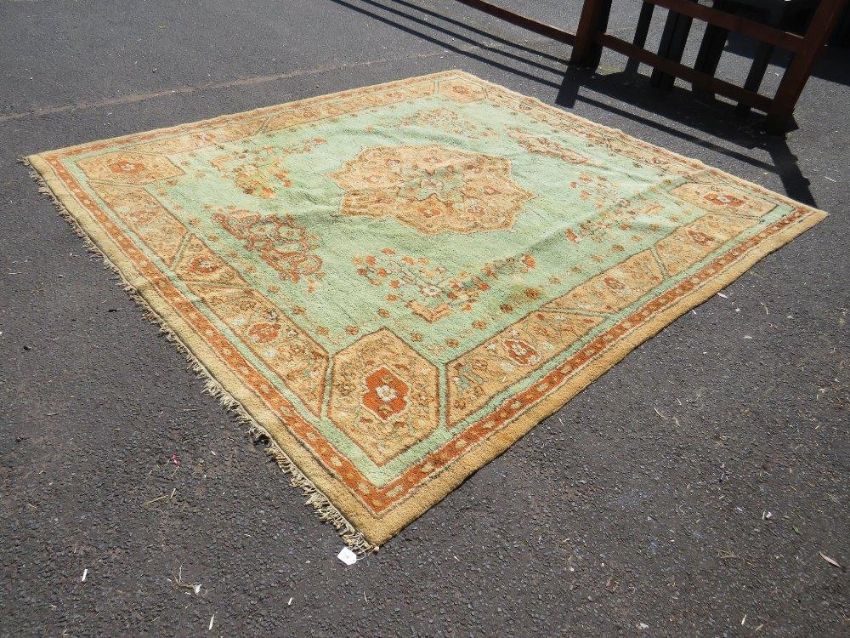 A large late 19th/early 20th century woollen rug on a mainly green ground, approximately 295 x 272 cm