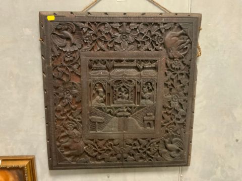 A EASTERN / ORIENTAL CARVED HARDWOOD WALL HANGING PANEL, DEPICITING ANIMALS, FIGURES AND FOLIAGE, 60 x 62 cm