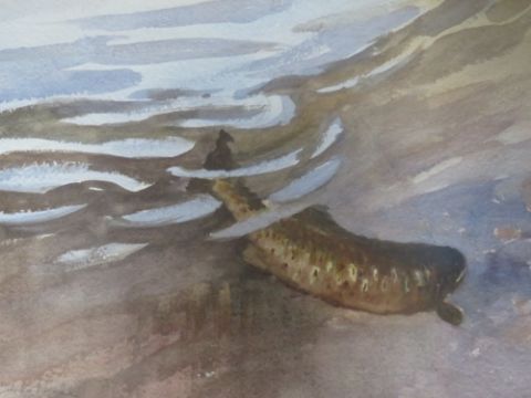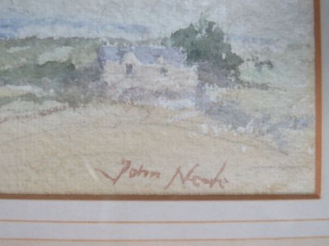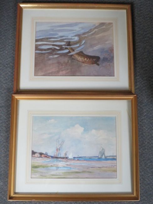 JOHN NEALE (b.1900). English school, coastal landscape, rural landscape with village, angling scene with fish being played and 'Thames Barges on The Orwell', two signed bottom left and two signed bottom right, watercolours, framed and glazed, two 26 x 36 cm and two 17 x 28 cm (4)