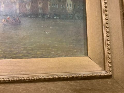 CLIFFORD M? - AN OIL ON CANVAS DATED 1911 OF A CONTINENTAL TOWN RIVER SCENE WITH BOATS AND FIGURES