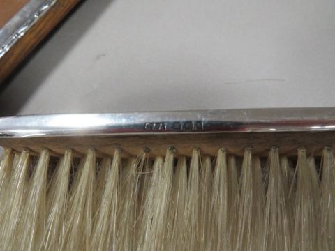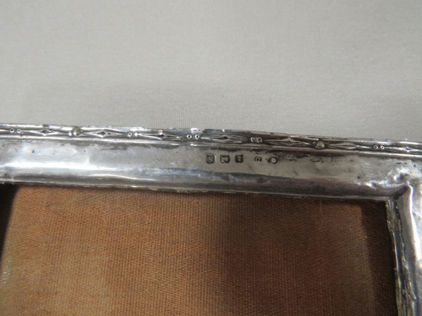 AN ANTIQUE SILVER PICTURE FRAME HALLMARKED BIRMINGHAM 1917 AND SILVER PIQUE BRUSH