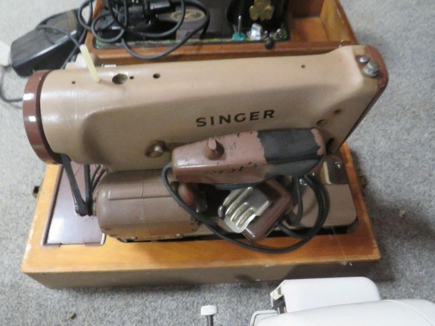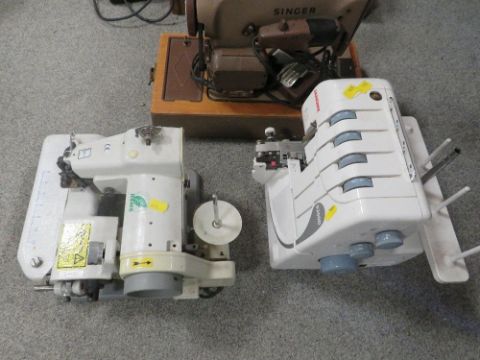 FOUR ASSORTED VINTAGE SEWING MACHINES TO INCLUDE SINGER ETC - A/F TOGETHER WITH TWO OVERLOCK STYLE MACHINES (6)