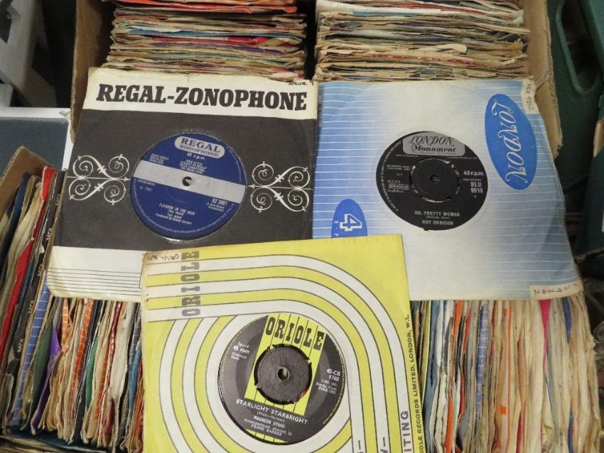 TWO BOXES COMPRISING APPROX 500 7" SINGLE RECORDS TO INCLUDE TONY HAZZARD, FREDDIE & THE DREAMERS ETC