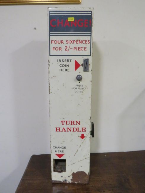 A WALL MOUNTED 'FISHOLOW' CHANGE MACHINE, for sixpences for 2/-, metal construction, H 76 cm, W 18 cm