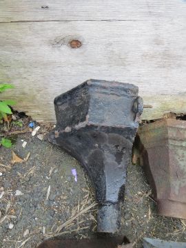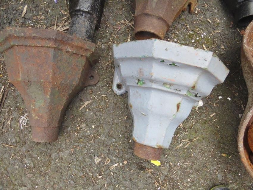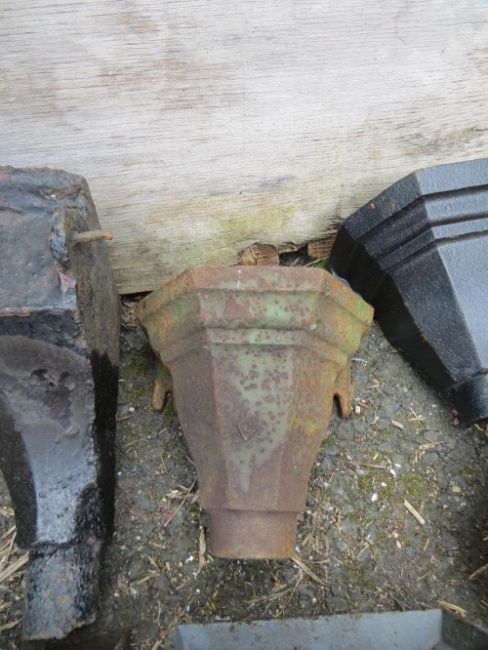 A SELECTION OF CAST IRON DRAIN / GUTTER WATER HOPPERS TOGETHER WITH A TROUGH/ PLANTER