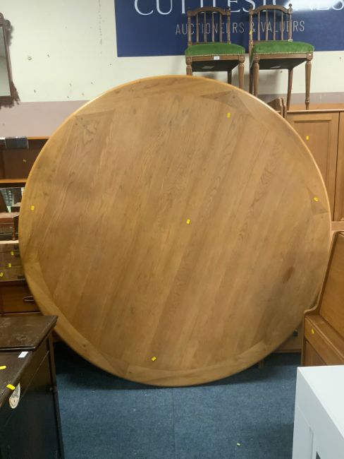 A huge circular, heavy oak dining table together with six heavy oak chairs Dia. 190 cm