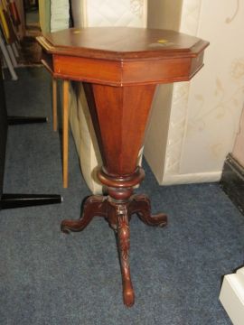 A 19TH CENTURY MAHOGANY SEWING BOX ON TRIPOD STAND