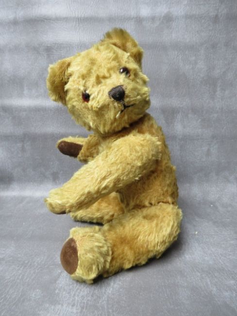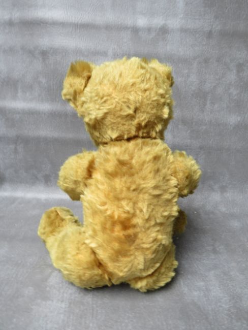 A MID CENTURY VINTAGE MOHAIR TEDDY BEAR WITH BELLS TO EARS, fully jointed, velvet pads, H 39 cm