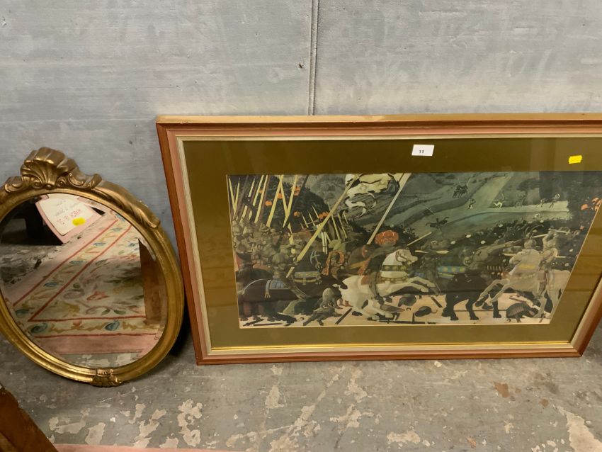 FOUR FRAMED PRINTS TO INCLUDE SIGNED EXAMPLES TOGETHER WITH A GILT FRAMED MIRROR (5)