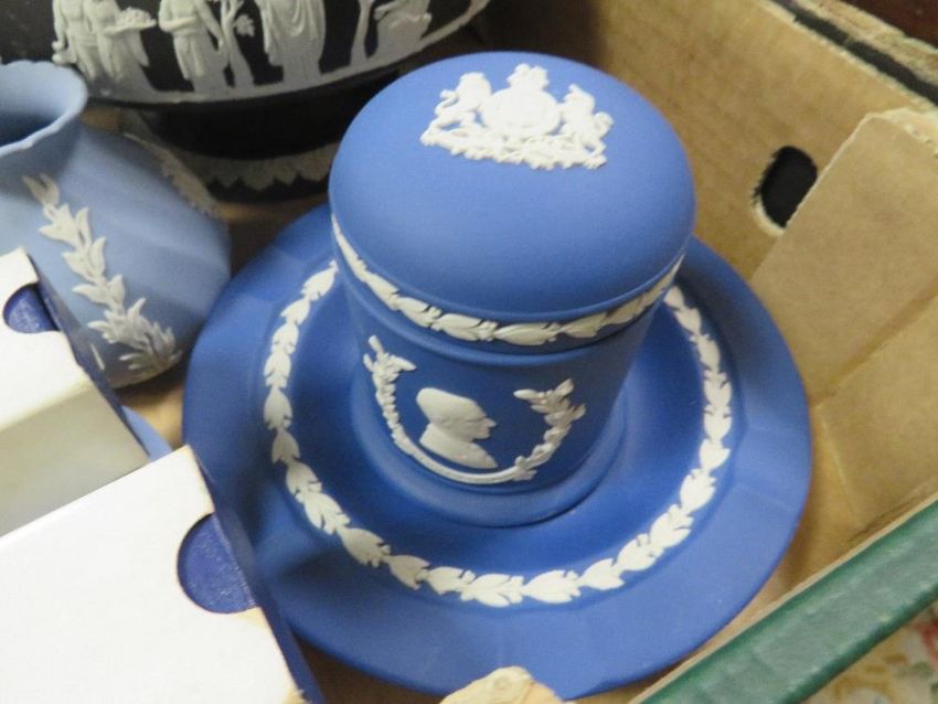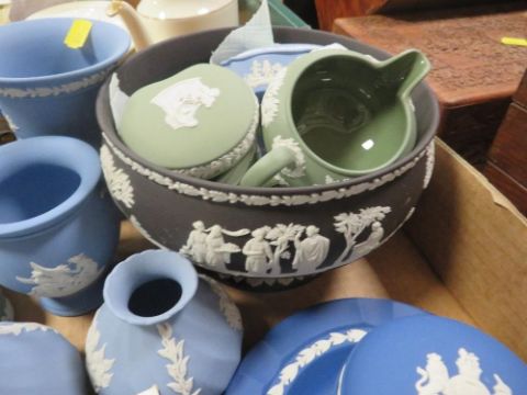 A TRAY OF WEDGWOOD JASPERWARE IN ASSORTED COLOURS TO INCLUDE A BLACK JASPERWARE IMPERIAL BOWL