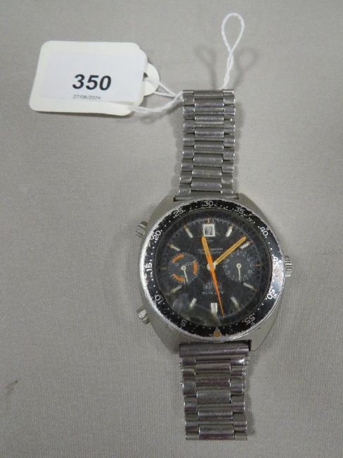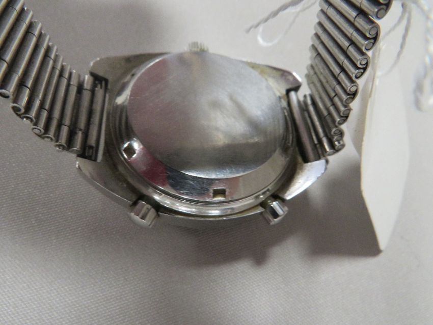 A VINTAGE AUTAVIA HEUER AUTOMATIC CHRONGRAPH WITH TWO SUBSIDIARY DIALS AT 3 AND 9 O'CLOCK DATE WINDOW AT 6 O'CLOCK , LIMINUS ORANGE HANDSA AND HOUR MARKER BUTTONS, ON STAINLESS STEEL BRACELET - VERY MUCH A/F WITH NUMEROUS FAULTS INCLUDING CHI[PPED AND CRACKED CRYSTAL ETC UNTESTED AND WORKING CAPACITTY UNKNOWN