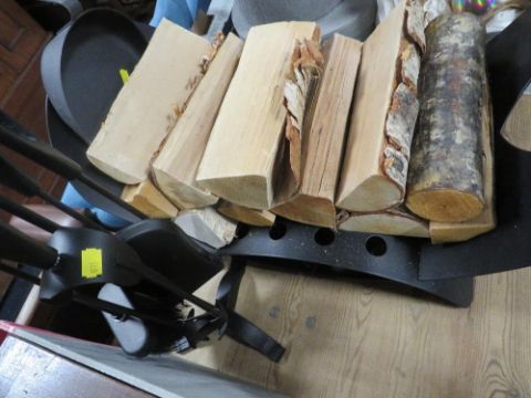 A MODERN COMPANION SET TOGETHER WITH A LOG HOLDER