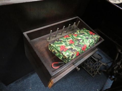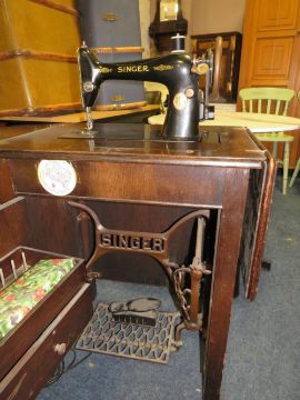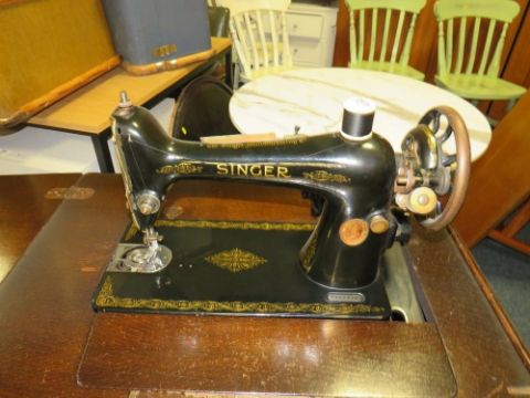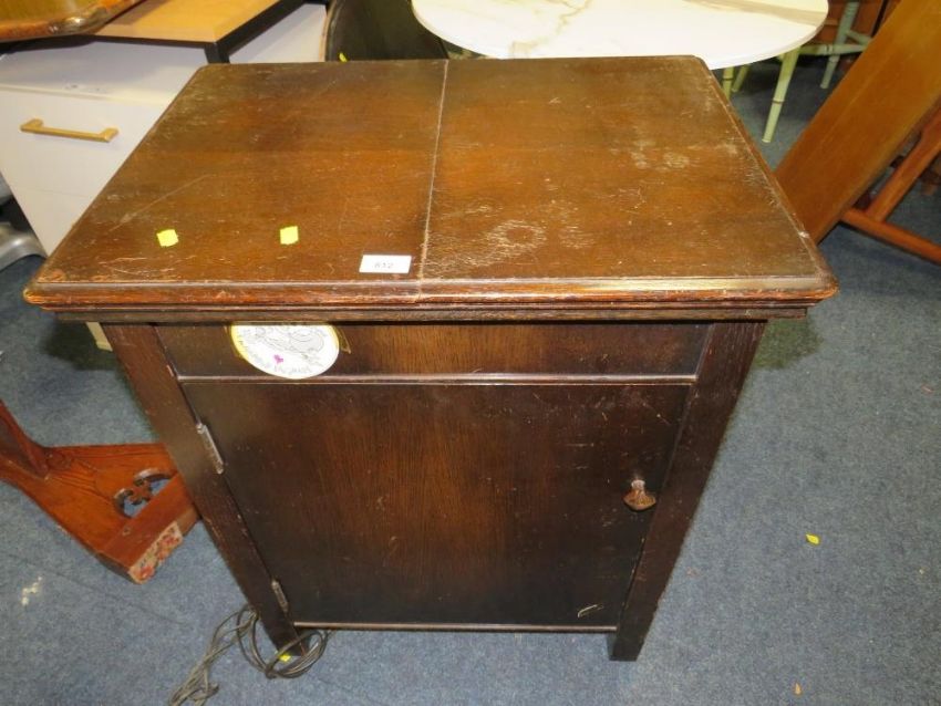A vintage singer electric sewing machine in oak cabinet