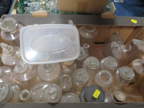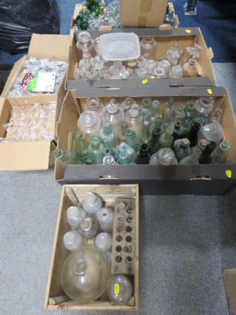 FOUR TRAYS OF ASSORTED CHEMISTS, SCIENTIFIC AND OTHER BOTTLES
