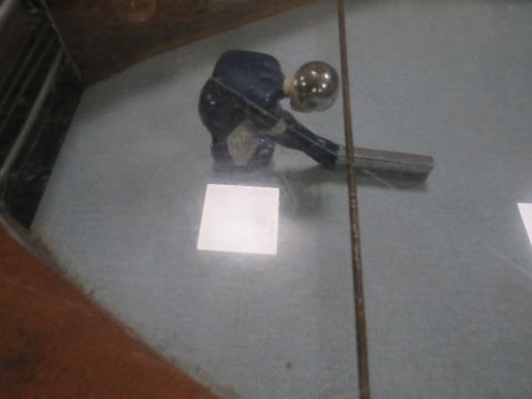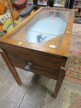 A VINTAGE 'R & W' ICE HOCKEY GAME, of mainly wood construction, with glaze top, fitted with coin operated mechanism, A/F, H 75 cm, W 55 cm, L 107 cm