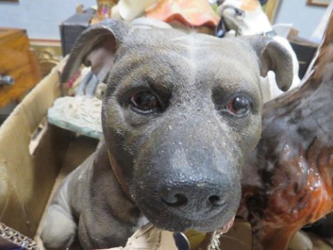 A TRAY OF ASSORTED CERAMIC AND RESIN ANIMAL FIGURES TO INCLUDE A SAUSAGE DOG BOOT SCRAPER