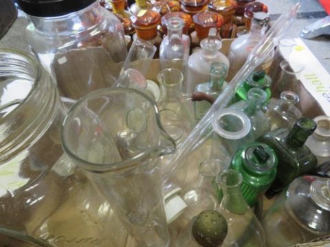 TWO TRAYS OF ASSORTED CHEMIST BOTTLES ETC TOGETHER WITH A TRAY OF EQUIPMENT, BLOOD PRESSURE MACHINES ETC