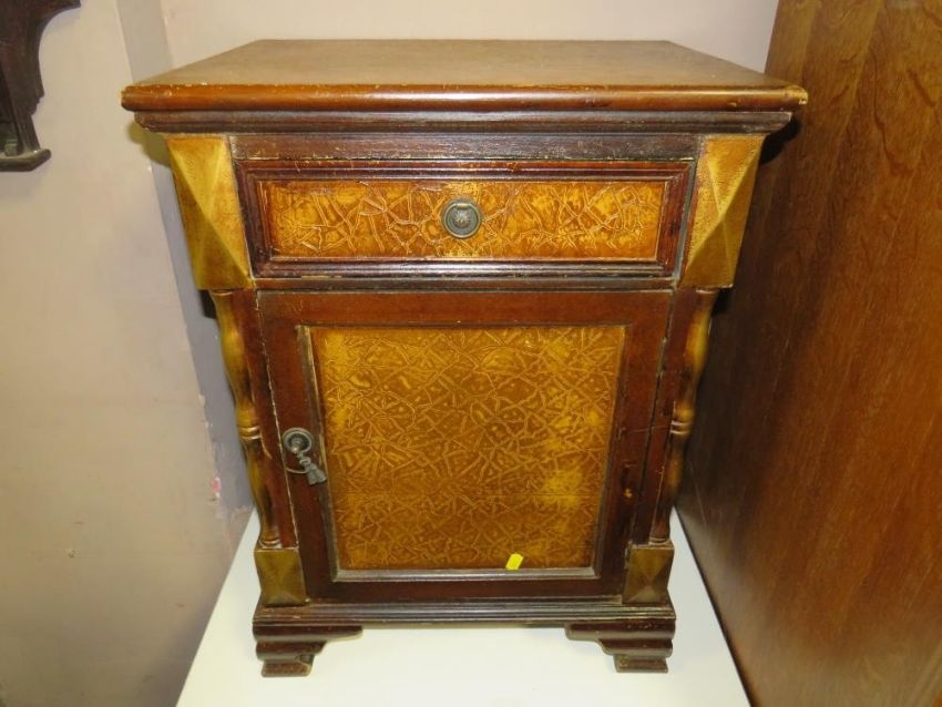A WHITE PAINTED THREE DRAWER CHEST TOGETHER WITH A FAUX LEATHER STYLE CABINET (2)