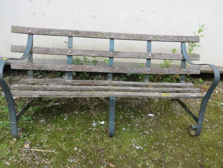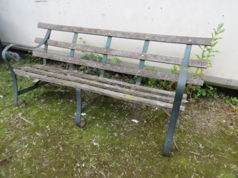 A VINTAGE WROUGHT IRON AND WOODEN GARDEN BENCH