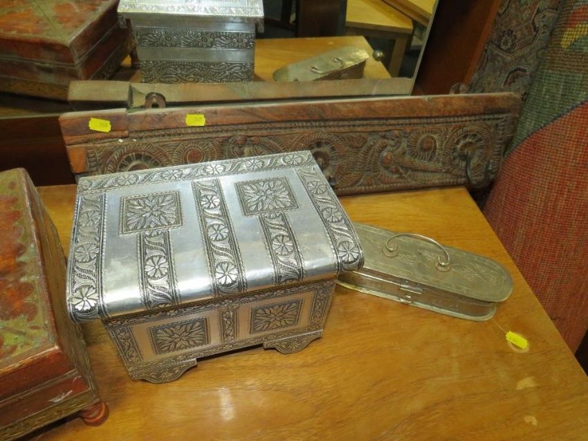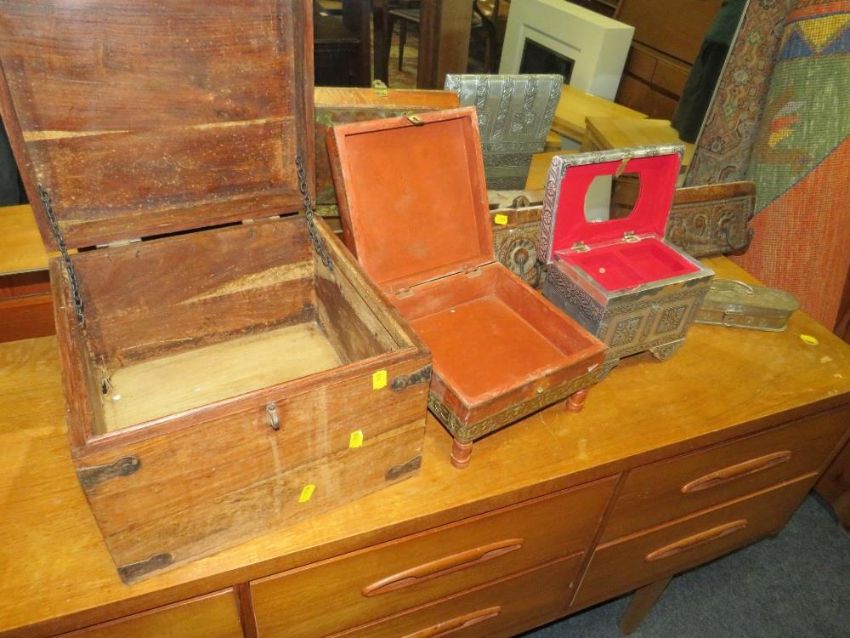 An eastern wooden hardwood box together with another similar example, two metal boxes and coat hooks