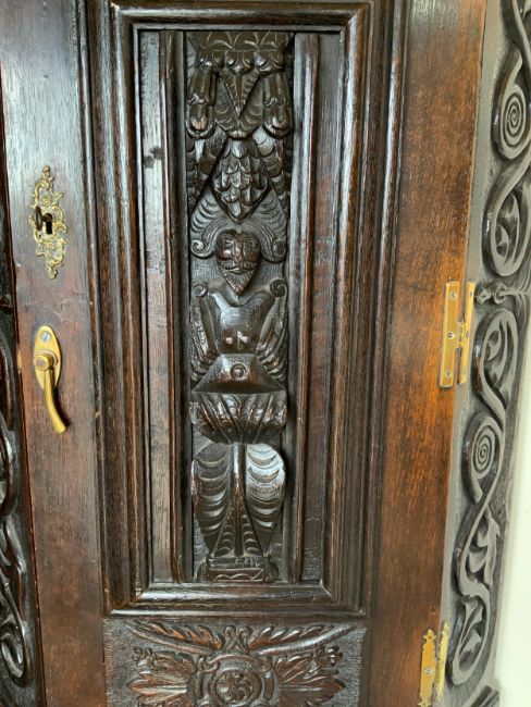 An antique oak heavily carved corner cupboard on a later stand, cupboard H 113 cm