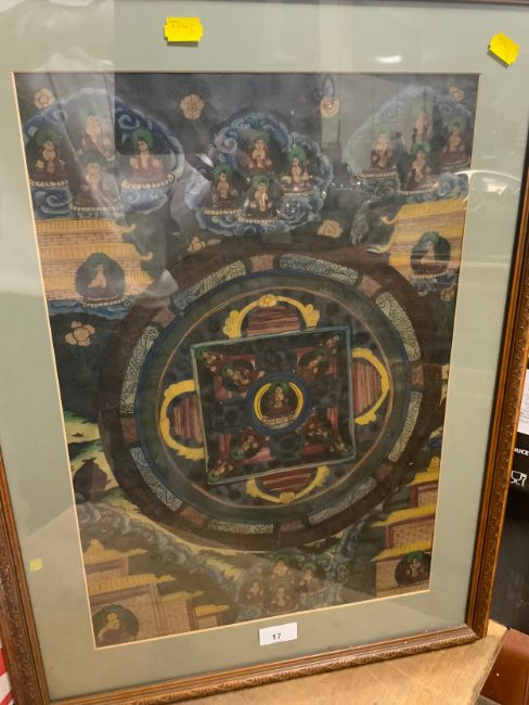 A FRAMED TIBETAN THANGKA PAINTING ON FABRIC 49CM X 65CM ( INCLUDING FRAME )
