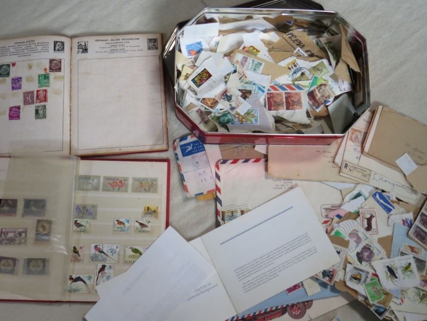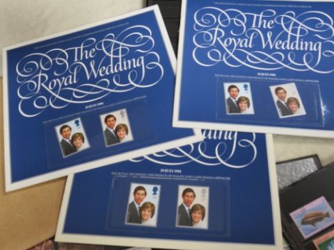 FOUR LARGE ALBUMS OF STAMPS, mainly Royal Wedding / Charles & Di etc., plus a further eight smaller stamp albums and a tin and bag of loose stamps, the smaller albums contain mainly African stamps, album of first day covers and a small collection of stamp packs